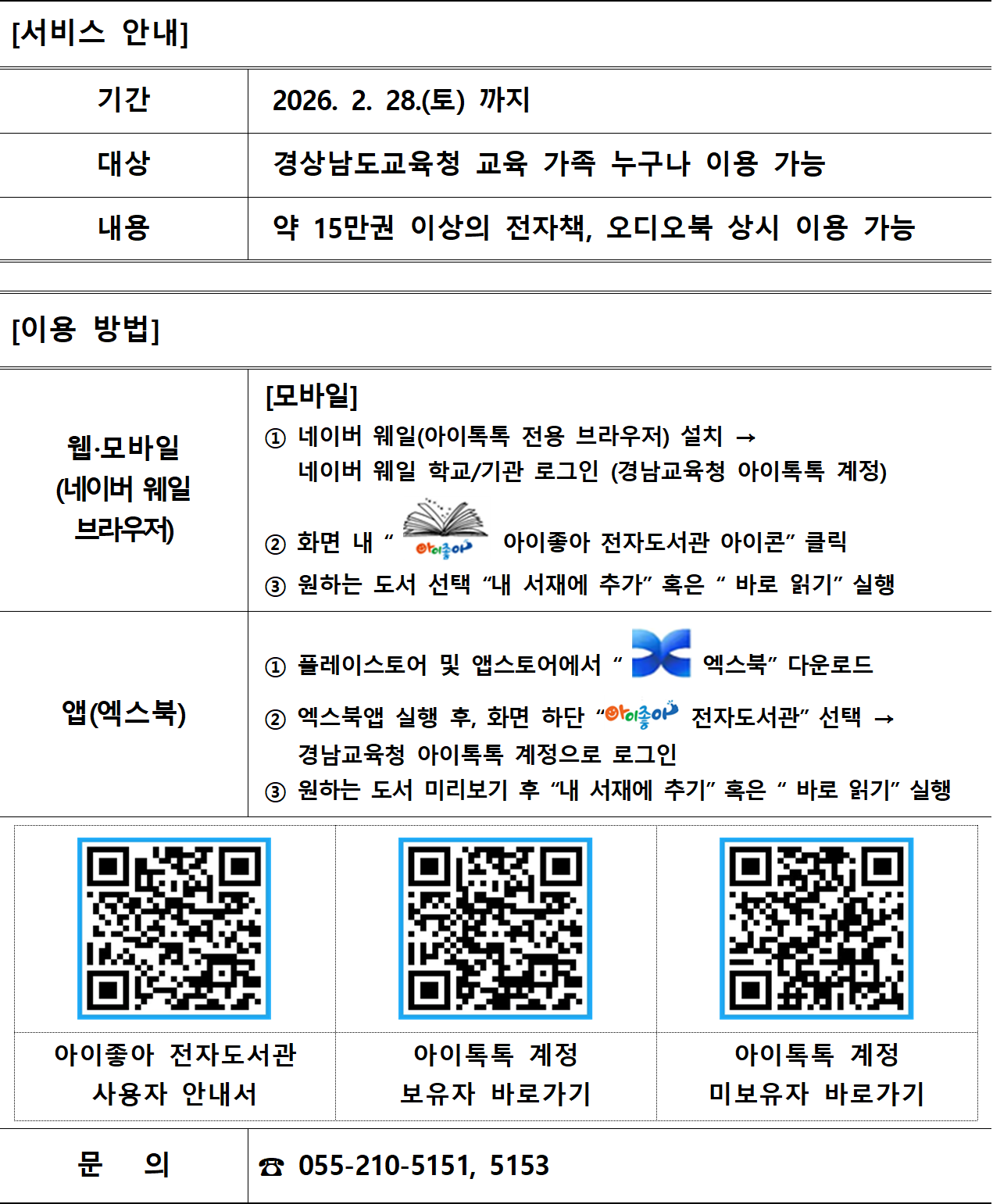경남 교육가족이면 누구나 전자책과 오디오북을 상시 이용할 수 있으니, 가정에서 자녀의 독서 지도 및 가족 독서 활동에 많은 활용 바랍니다.